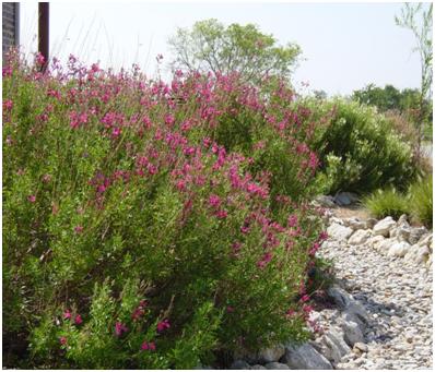 Benefits: extremely drought tolerant (can live off central TX rainfall – even as low as 8 inches a year) attracts humming birds, butterflies, deer resistant, nice flowers purple especially after a rain. Evergreen Needs little to no fertilizer. Survives our winters. Can find at all garden stores, Home Depot, Lowes, etc.