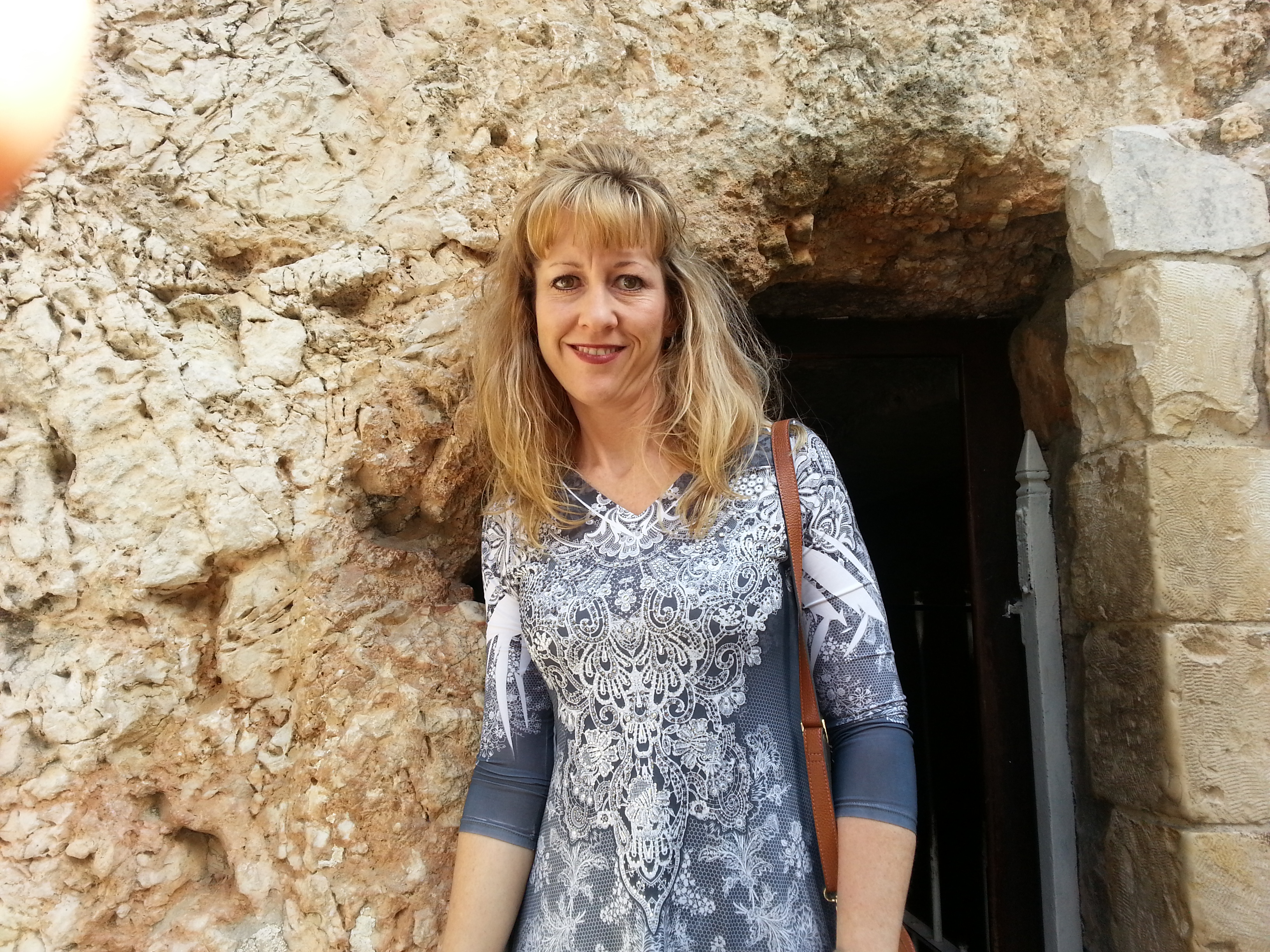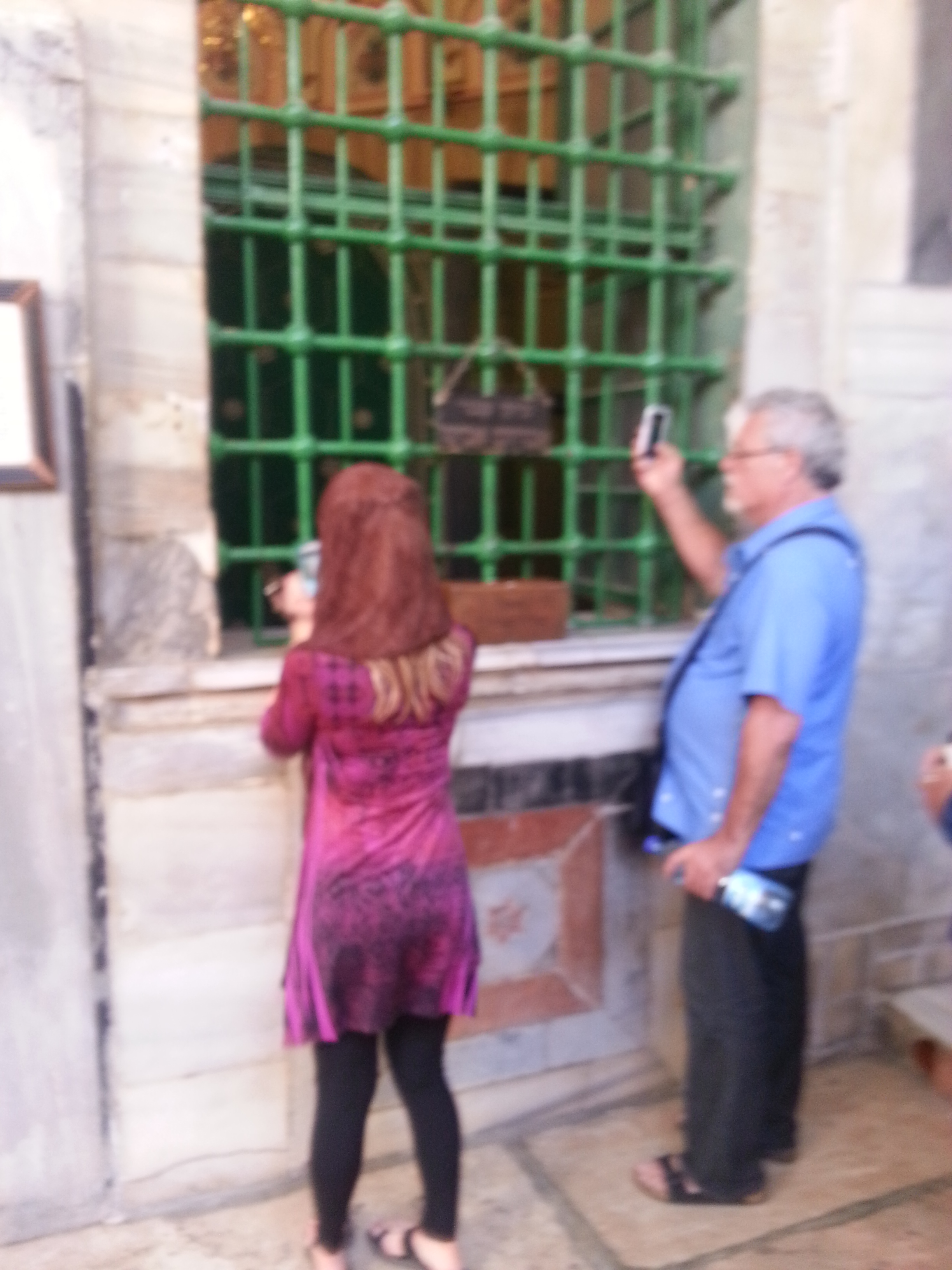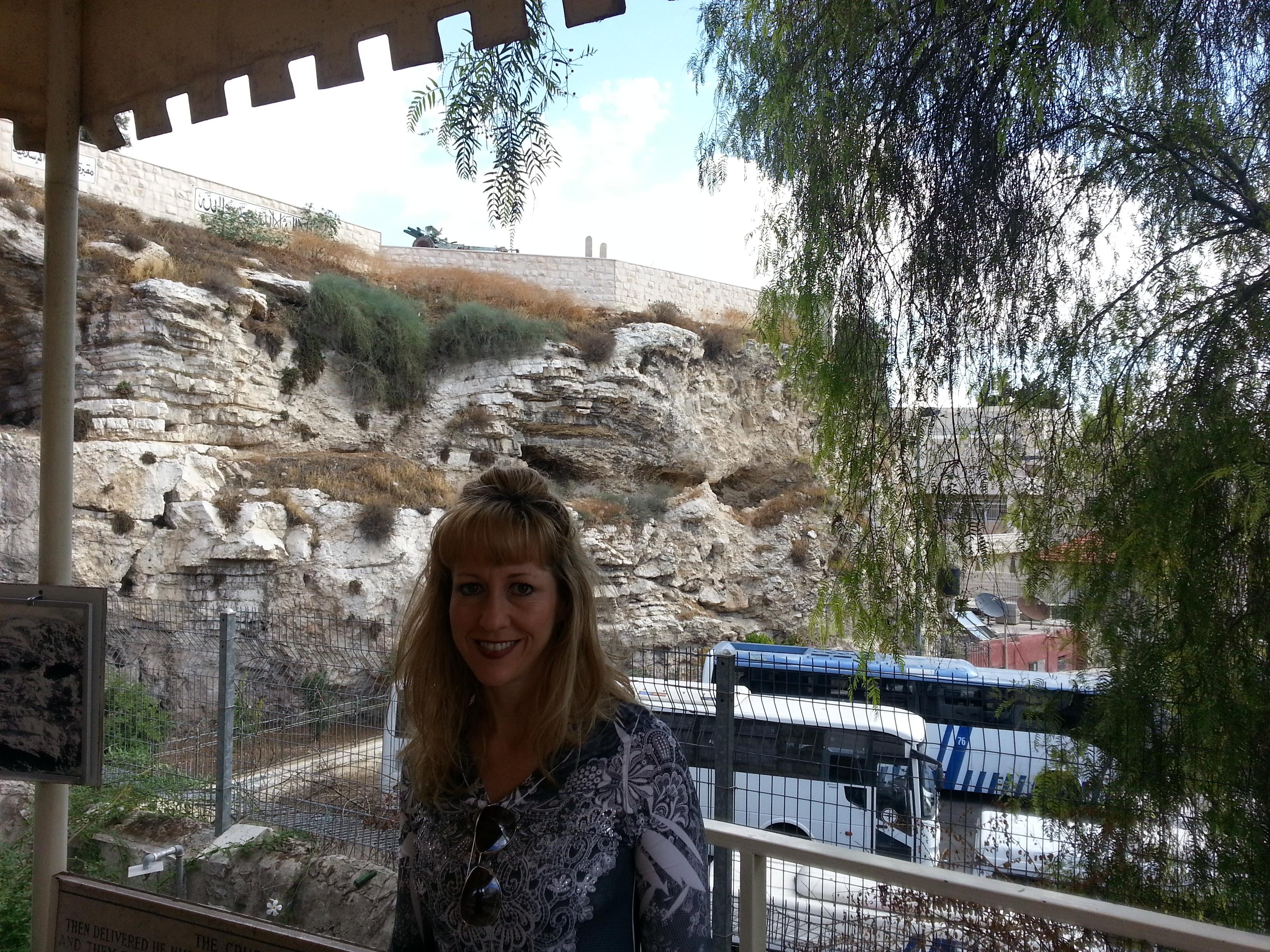 Pictured below is Skull Hill or Golgatha, it is one of the places thought that Jesus was crucified. Just out side the city walls on a busy street. Notice the two depressions into the rocks behind Niki’s head that look like a skull. (Matthew 27:33, Mark 15:22, Luke 23:33 & John 19:17)