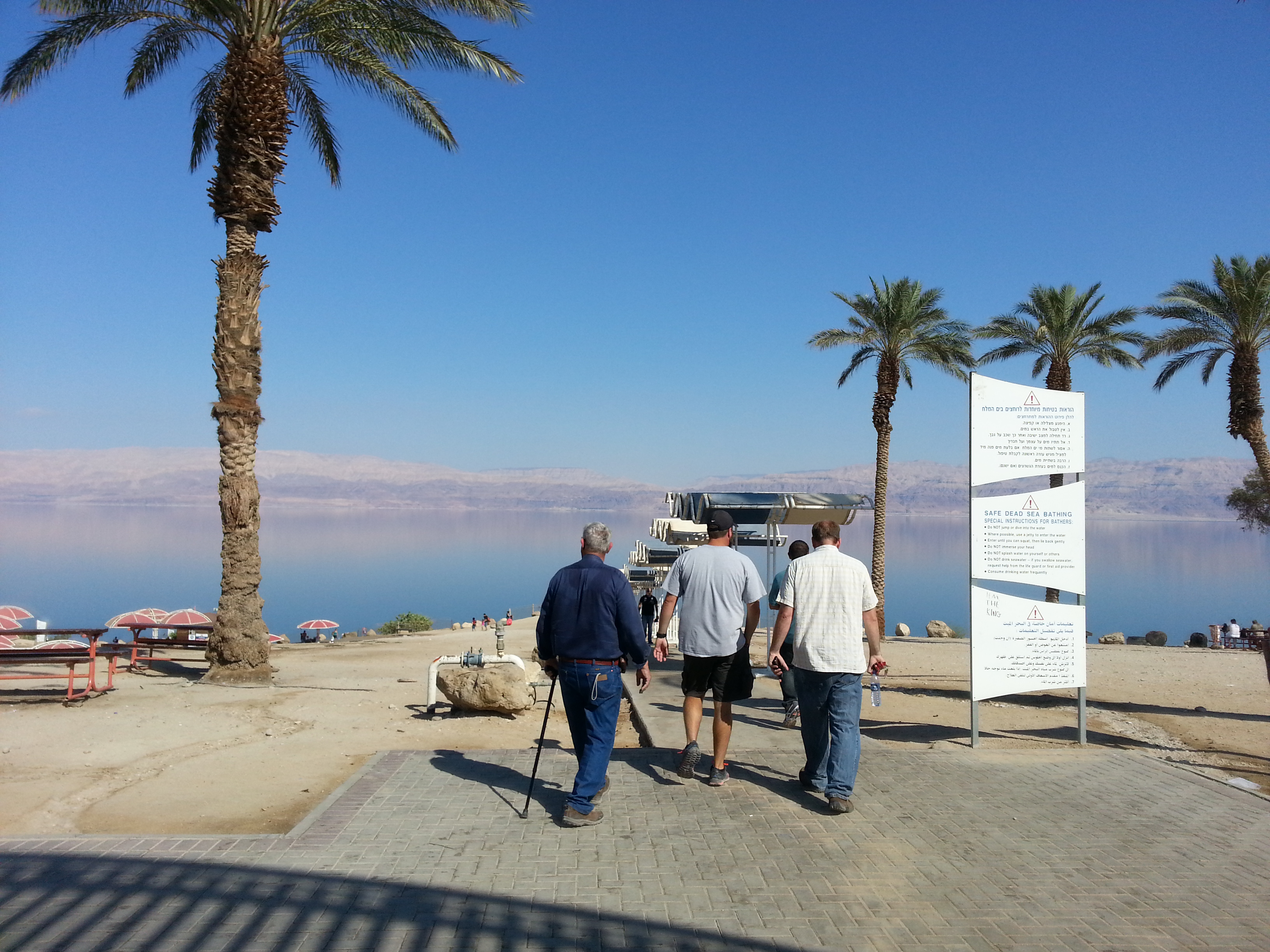 At the Dead Sea which is the lowest place on earth: 1,388 feet below sea level! As well as the saltiest body of water, 10 times as salty as the ocean. In the bible it’s called the Salt Sea and mentioned at least 10 times. Also near by was the community of Qumran where the dead sea scrolls were found.