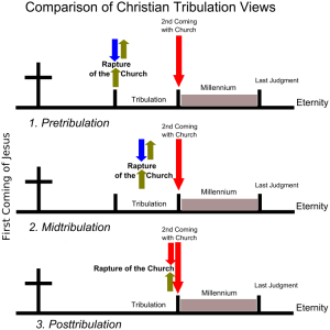 Through the years three main theories have emerged concerning the timing of the Rapture: pretribulationism (the belief that the Rapture will occur before the Tribulation begins), midtribulationism (the belief that the Rapture will occur at the midpoint of the Tribulation), and posttribulationism (the belief that the Rapture will occur at the end of the Tribulation). For more details about each, go here.