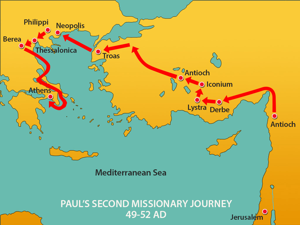 A few months later, in approximately A.D. 50, Paul and Barnabas discussed a second trip, to visit the churches they had established on their first missionary journey (Acts 15:36). But because of a disagreement over Mark, they went separate ways: Barnabas and Mark sailed for Cyprus, while Paul and Silas went through Syria and Cilicia (Acts 15:37-41). On this trip, Paul and Silas visited the believers at Derbe, Lystra, and Iconium. Then, passing through the region of Phrygia and Galatia, they journeyed to Troas. There, through a vision, God told Paul to travel to Macedonia (Acts 16:1-10). Obeying the Holy Spirit, Paul and Silas sailed to Samothrace and then to Neapolis. From there they traveled to Philippi, where they ministered for several days (Acts 16:11-40). Upon leaving Philippi, Paul and Silas traveled through Amphipolis and Apollonia to Thessalonica. Next they went to Berea, and then to Athens and Corinth, where they stayed for some time (Acts 17:1-18:18). Leaving Macedonia, they traveled to Ephesus. Then they sailed to Caesarea and made their way back to Antioch.