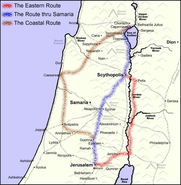 In New Testament times, the Jews despised Samaritans and would have nothing to do with them. The Samaritans were still living primarily around Mount Gerizim (John 4:1–42), but also kept to their own villages (Matthew 10:5; Luke 9:52). Scripture mentions encounters with Samaritans in towns bordering Samaria (Luke 17:11–19) and on roads between Jerusalem and Jericho (Luke 10:29–37).